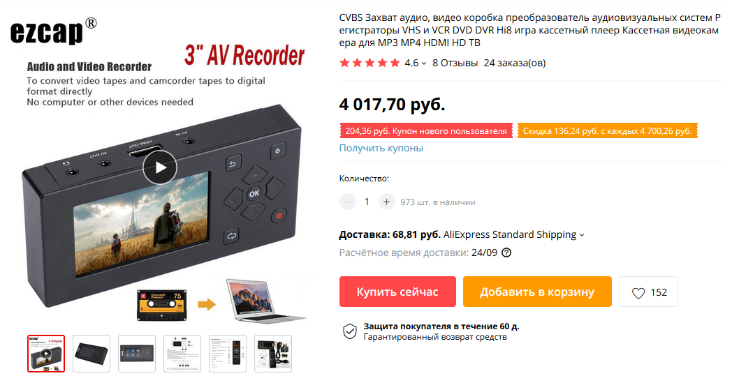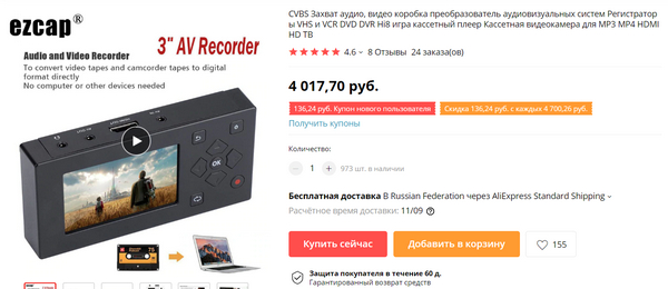Какую штуку любопытную посоветовали в комментариях - EZCap. Оцифровка старых видеокассет и кассет от видеокамер без компьютера. Имеет пульт управления, также умеет оцифровывать аудиокассеты. (Но понятно, что это для ленивых. Перегонять вручную через комп с хорошей картой захвата - качество будет заметно лучше, но и мороки заметно больше. Помнится, я этим занимался в своё время.)