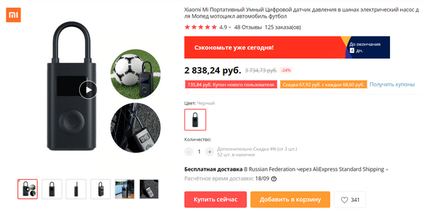 Компактный компрессор от Xiaomi - для накачивания шин автомобилей, мотоциклов, велосипедов, надувных матрацев, мячей и так далее. Скидки там никакой нет, но я заказал - штука очень полезная.