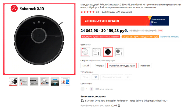 На знаменитый робот-пылесос Xiaomi Roborock S50/S55 (есть доставка с российского склада) цена сейчас на уровне июньской распродажи. Видимо, это знак, что пора его уже заказать для обзора. Я своим дешевым Puppyoo wp650 за $70 вполне доволен (прикольный пылесос, цена на него гуляет от 5 до 15 тысяч, я покупал за 5), но тот очень простенький, а этот очень навороченный, надо поизучать.