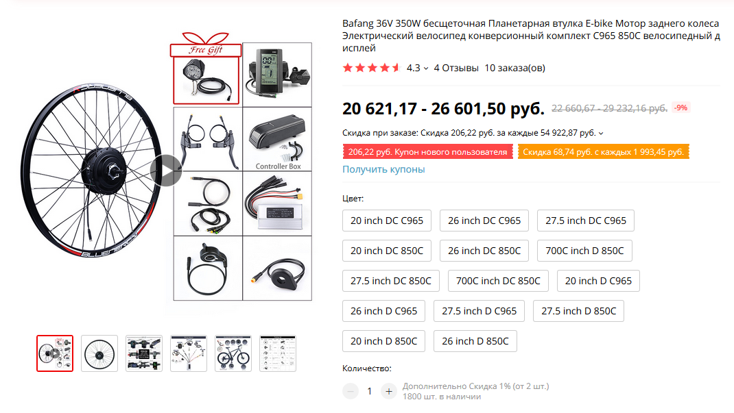 Внимание: батарея покупается отдельно! И это правильно. В комплектах обычно идут говенные батареи (цена комплекта, маркетинг и все такое). Так что лучше отдельно брать качественный комплект мотор-колеса и к нему заказывать дополнительно батарею.