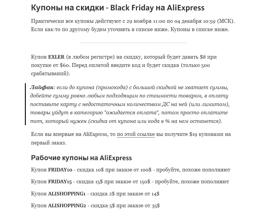 Также читатель kamrad ведет страничку со списком самых разнообразных купонов-промокодов - пользуйтесь Black Friday AliExpress.