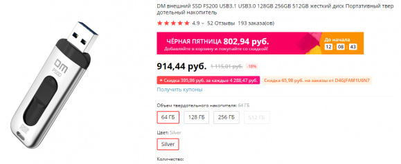 Портативный SSD в формате флешки - 64/128/256 ГБ. Обещают, что быстрая - 200-300 Мб/сек. Я сам не тестировал пока, просто заказал. Напишу как потестирую. 914 рублей за 64 ГБ выглядит интересно, если реально быстрая. Ну и на распродаже - от 802 рублей.