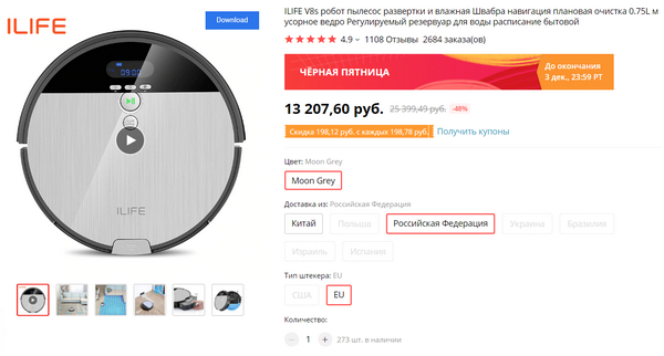 Upd: Новая модель продвинутого робота-пылесоса для сухой и влажной уборки - ILIFE V8s. Есть поставка с российского склада. Цену заметно снизили.