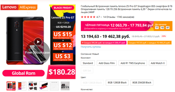 На Lenovo Z5 Pro GT в сравнении с 11.11 уронили цену еще на три тысячи - сейчас  12063 рубля. За эти деньги: Snapragon 855 (372000 по Antutu), полностью безрамочный экран Super AMOLED 6.39" FHD+, 8/128 ГБ, двойная камера 24/16 Мпикс, аккумулятор 3350 мАч, быстрая зарядка 18 Ватт. Селфи-камера сделана в виде слайдера, то есть выдвигаете ее вверх. На старте продаж стоил 28 тысяч, цена сейчас ниже в 2,3 раза. За такие деньги - просто бомба, я считаю. Но - китайская версия с Global ROM. У меня есть Lenovo K5 Pro китайский с Global ROM - никаких проблем, только при получении пришлось сделать сначала полный сброс, чтобы убрать понапиханную рекламу - она полностью пропала.