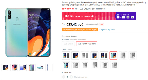Samsung Galaxy A60  с предыдущей распродажи подшевел еще на 2 тысячи - теперь 12 тысяч рублей. В России, судя по Яндекс.Маркету, он пока еще не продается, только предыдущие модели. Здесь Snapdragon 675, 6/64 ГБ, NFC, 3500 мАч аккумулятор, камера 32 Мпикс - характеристики очень хорошие.