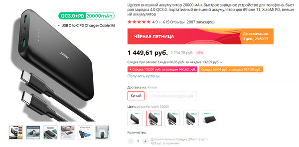 Отличный мощный и быстрый внешний аккумулятор от Ugreen на 20000 мАч. Есть и QC 3.0, и Power Delivery. За 1449 рублей (плюс еще скидки по купонам) - очень даже хорошо, заказал себе. Самый дешевый вариант в списке (1099) - последний, он без QC 3.0 и PD, просто батарея на 20000 мАч.