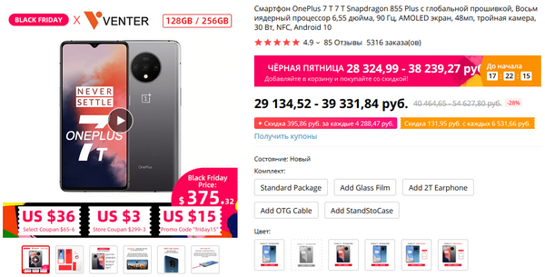 На крутейший смартфон OnePlus 7T цена еще опустилась на пару тысяч. Плюс промокод friday15 - еще минус тысяча. Уже существенно, я его 11 ноября купил за 30 с чем-то. Это китайская версия с глобальной прошивкой. Знающие люди говорят, что прошивка нормальная, в европейской версии - такая же, а разница с официальной европейской - аж 12 тысяч рублей. Ко мне еще не доехал, жду. Кстати, в данном случае есть ограничения: больше 5 смартфонов в одни руки не дают ?
