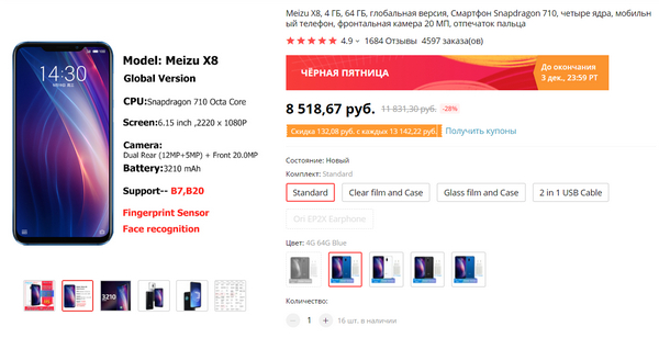 Смартфон Meizu X8 4/64. Очень достойные характеристики за такие деньги. Дополнительную скидку даст промокод EPNBF10.
