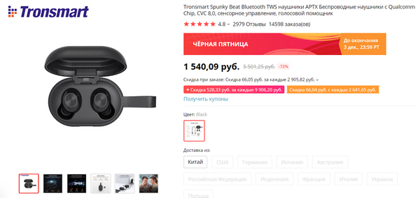 Не сказать что большая скидка (11 ноября они были слегка дешевле), но очень пристойный вариант TWS-наушников от проверенного производителя  - Tronsmart Spunky Beat. Поддержка aptX и AAC, влагозащита IPX5, автономность до 7 часов (до 24 часов при зарядке от кейса), также у кейса есть коротки кабель с USB 2.0, что позволяет его подключать к порту USB компьютера без дополнительных проводов. Управление сенсорное. Ко мне они с прошлой распродажи приехали, скоро будет обзор. Но вообще у меня было несколько устройств Tronsmart - все показали себя очень достойно.