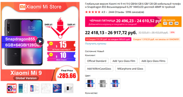 Xiaomi Mi 9 показывает такие же скидки, как и на 11.11 -  всего 20 тысяч. (На Яндекс.Маркете он в основном 26-30 тысяч.) Мой обзор.