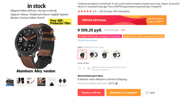 Глобальная версия хороших и действительно красивых умных часов Amazfit GTR (мой обзор). Скидки на них не дали (только перед продажей цену на денек раза в два повысили), но тут можно поиграться купонами и промокодами, после чего цена получится уже 7681, то есть пару тысяч можно скинуть. Что использовать при покупке? Купон на странице товара, спецкупоны  и промокод WBBF10.