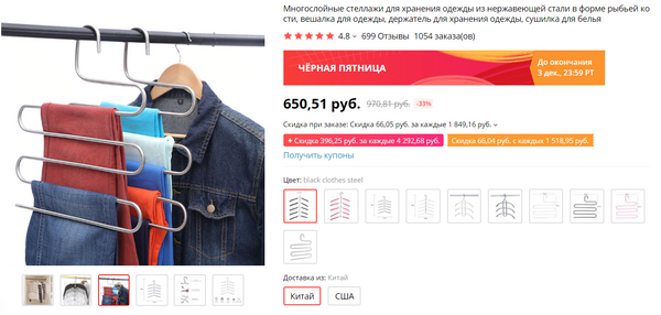 Еще более удобный вариант многопортовых вешалок. Тут суть в том, что их разворачиваете горизонтально и вешаете рубашки, как обычно. А потом поворачиваете под наклоном или вовсе вертикально - все это занимает в пять раз меньше места. Отлично, тоже заказал себе.