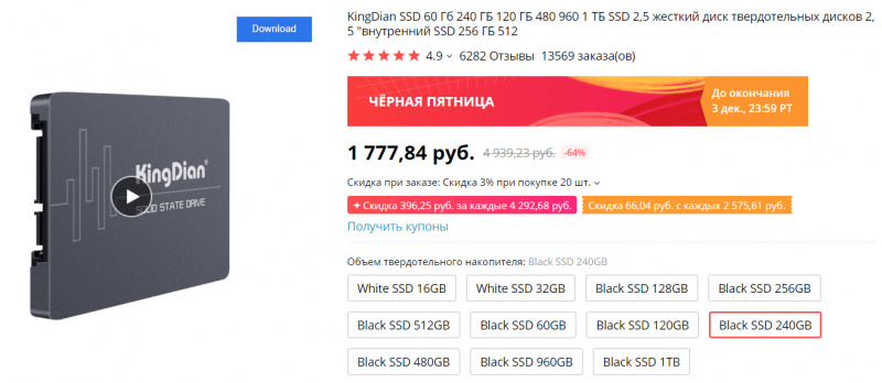 Недорогие SSD Kingdian от 16 ГБ до 1 ТБ. На 240 ГБ - 1777 рублей, этого объема вполне хватит для системного диска (и чтобы примерно половина оставалась свободной). 480 ГБ - 2781 рубль. Ну и терабайтный - 5147 рублей. Пожалуй, возьму себе именно терабайтный- для оперативного хранения всяких несистемных данных. А то у меня там для данных терабайтный HDD стоит: временами раздражает своим шумом. Для скидки применяйте купон продавца, общий купон и промокод exlerblack5.