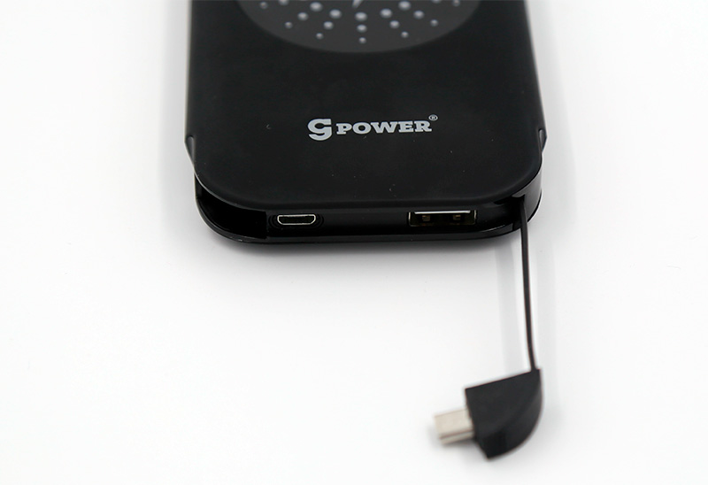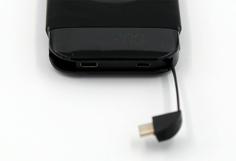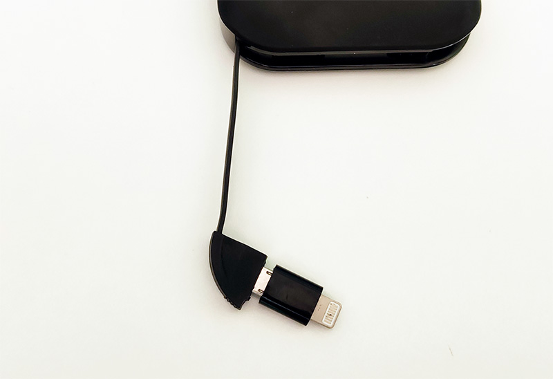 На нижнем торце батареи - вставленный в углубление переходник microUSB-Lightning, порт USB 2.0 и встроенный убираемый кабель с microUSB.