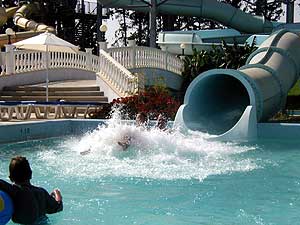 Трудно сказать, что мне там понравилось больше всего. Каждый аттракцион был по-своему интересен и забавен. Трубы с водой, по которым едешь на надувном круге, все набирая скорость, а потом врезаешься в воду - это вполне приятное развлечение, особенно если учесть, что из десятка подобных аттракционов можно выбрать наиболее соответствующий вашему представлению о скорости, с которой позволительно врезаться в воду. Я опробовал их все. От детских, когда в воду не врезаешься, а сваливаешься туда медленно и печально, до весьма жутких и крутых спусков, когда в воду влетаешь с такой скоростью, что становится страшно за надувной круг, на котором ты едешь. Я даже рискнул прокатиться по почти отвесной трубе, идущей с большой высоты, которая, к тому же, на всем протяжении полностью закрыта. Вот уж раздолье для клаустрофобов: въезжаешь в абсолютно черную трубу, затем тебя там колбасит со страшной силой, после чего вышвыривает в бассейн в тот момент, когда ты думаешь, что это уже никогда не закончится. Незабываемые ощущения, честное слово!