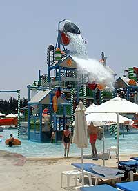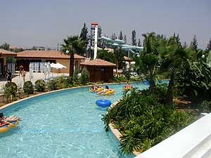 Лимасольский аквапарк "Watermania" находится за городом, километрах в десяти, и занимает довольно обширную территорию, обнесенную весьма условным забором. Набор аттракционов - впечатляет. Я хорошо помню некие заведения с одной единственной пластмассовой трубой, лениво сваливающей вас в лягушатник с грязной водой, которые тем не менее не стеснялись именоваться "аквапарком". Но "Watermania" свое название несет с полным на то правом. Потому что одних только труб различных конфигураций и крутизны (в данном случае имеется в виду угол наклона) я насчитал штук десять, а там еще есть два вида водяных горок, бассейн с искусственной волной, несколько бассейнов "для кайфования", совершенно шикарный детский водный аттракцион (где взрослые резвились почище детей), бассейн с тренажером, тот самый знаменитый "апельсин", о котором рассказывала Катя, аттракцион "черная дыра", а также "ленивая река" - длинный извилистый бассейн, проходящий по всему периметру аквапарка. Так что в "Watermania" можно было действительно загрузиться на целый день, и даже, пожалуй, дня бы не хватило, чтобы вдоволь насладиться всеми аттракционами.