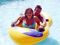 После того, как мы отдали должноепочти всем аттракционам, настал черед "ленивойреки" - извилистого бассейна с небольшим,но заметным течением, проходящего через всютерриторию аквапарка. Вам полагалосьоседлать одиночный или двойной круг (впрочем,у "ленивой реки" были также надувныебаллоны, куда помещалось человек пять),после чего течение вас медленнопрогуливало по всему аквапарку. Причем попути перед вами возникали ещедополнительные развлечения: водопадики схолодной или обычной водой, тихие заводи,куда можно заплыть и заснуть, красивыеискусственные горки - тоже с водопадиками -и так далее. Мне "ленивая река" оченьпонравилась. Я по ней сплавал раза четыре,хотя полный круг занимает немало времени -минут десять, не меньше.