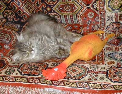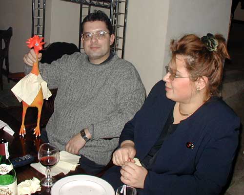 Второй кадр требует некоторых пояснений. Дело в том, что собравшиеся сделали мне совершенно демонический подарок - резиновую курицу, которая пищит в момент издевательств над ней, с каковой курицей я и развлекался почти весь вечер. На следующем снимке вы можете видеть Марию, меня и курицу, которая исполняет "Танец маленьких куриных лебедей":