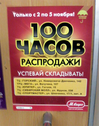 Ну, замечает Тень-Половинка, даже если магазин работает по 12 часов в день, то со 2 по 5 ноября - это будет всего 48 часов распродажи. Однако так хотелось написать "100 часов"... А чего мелочились? Написали бы "500 часов распродажи - в вашем воображении".