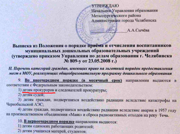 Обратите также внимание на то, как начальник управления образования Сычева ловко включила в список льгот и детей из социальных групп, а не только прокурорских инфантов. Каких групп? Ну, детей граждан, подвергшихся воздействию радиации в 1957 году. Им сейчас где-то за полтинник - как раз пора идти в детские сады. Кроме того, льготы даются и детям граждан, подвергшихся воздействию радиации в Чернобыле в 1986 году. Им сейчас где-то за двадцатник - как раз можно в ясельки.