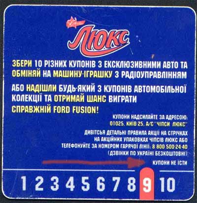 В руки 5k попал купон от чипсов "Люкс". Купон обещает как минимум машину-играшку с радиоуправлением, а как максимум - настоящий Ford Fusion! Да, но это только в том случае, если вы удержитесь и не сожрете купон! Говорят, что это мало кому удавалось - уж больно он аппетитный...