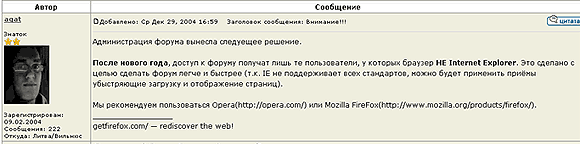 Особую прелесть объявлению придаёт тот факт, что это веб-дизайнерский форум... Мы с Бубликом просто плакали, прочитав этот небольшой шедевр. И правда - мечта веб-дизайнера: отсечь 75% пользователей, чтобы остальные могли в полной мере оценить его дизайнерские извраты, которые на фиг никому не нужны. Браво, ребята, просто браво!