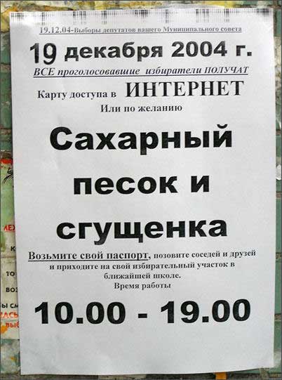 Evgenij - о новых технологиях выборов в муниципальный совет. Или клубничка из Интернета, или сахар и сгущенка - для непродвинутых в технологическом плане. Интересные методы. Куда там просто стакан водки, как было раньше, чтобы завлечь и расслабить благодарных избирателей...