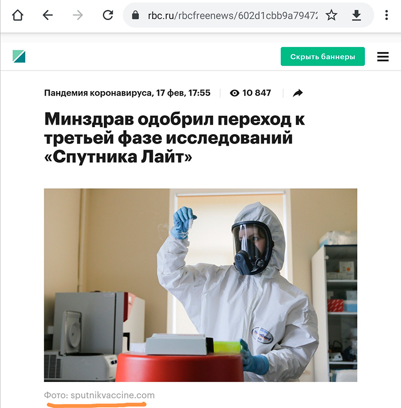 На "РБК", рассказал Алексей, публикуют фото с официального сайта вакцины "Спутник V". Для внимательного человека фото - прям "девушка с паяльником".