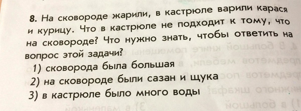 Задача: На сковороде жарили, в кастрюле варили карася и курицу. Что в кастрюле не подходит к тому, что на сковороде? Что нужно знать, чтобы ответить на вопрос этой задачи?