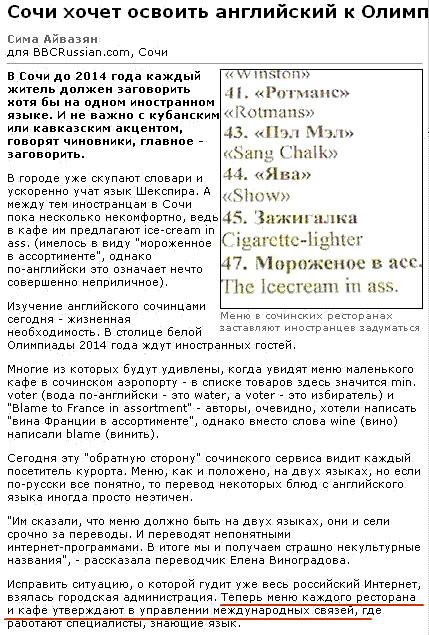 А я вам больше скажу. Ну, что английский язык в Сочи знают только в управлении международных связей - это как раз не фокус. Фокус в том, что в Сочи почти все владельцы кафе и ресторанов не знают русский язык. Практически все меню на русском - с жуткими грамматическими ошибками, я в этом убеждался постоянно. А они хотят, чтобы эти парни выучили английский? Какая святая наивность...