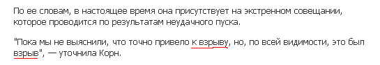 Эксперт Пола Корн, поведал Лесник, высказала интереснейшее предположение по поводу причины, приведшей ко взрыву ракеты со спутником.