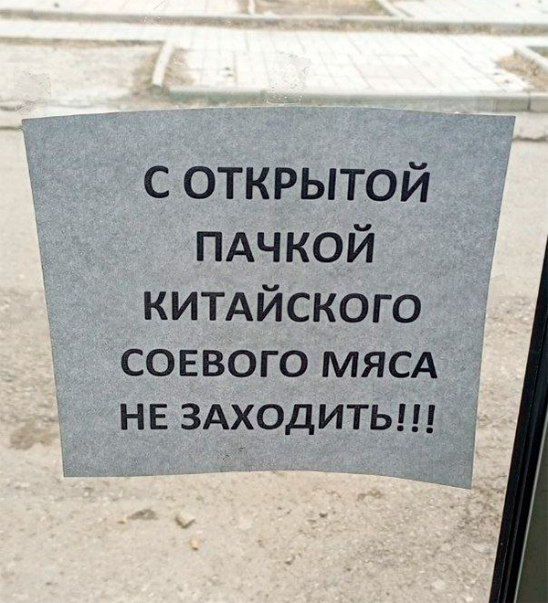 Вера прям даже заинтересовалась, чем таким пахнет китайское соевое мясо, что по поводу него отдельное объявление повесили? Раньше такое встречалось только по поводу дурианов.