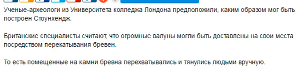 Наконец-то, радуется Андрей, британские учёные выяснили, как был построен Стоунхендж и был ли он вообще построен. Они просто помещали на камни брёвна, перехватывали брёвна и тянули их вручную. А камни оставались на месте, сбивались в стаю, и потихоньку возник Стоунхендж.