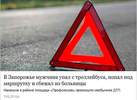 В сети есть запись с регистратора, как упомянутый мужик в запорожье упал с троллейбусса и попал под маршрутку. Рекомендуется к просмотру
