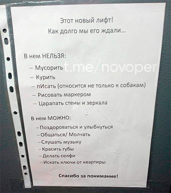 Отчаянный призыв жильцов в Новопеределкино. Но мы же понимаем, что лифту недолго остается быть совсем новым и с чистыми стенами.