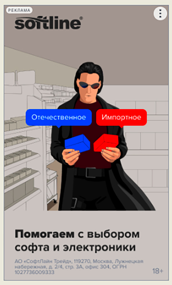 Какой тонкий намек сделан в этой рекламе, замечает наш читатель. Как известно, красная и синяя таблетки - это популярные символы выбора между мучительной правдой реальности (красная таблетка) и блаженной ложью иллюзии (синяя)", то есть "отечественная электроника" - это и есть "блаженная ложь иллюзии".