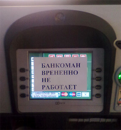 Банкоман - это человек, который сидит внутри банкомата и выдает купюрки. А не работает он врененно, потому что отбежал пописать. Почему врененно, а не временно? Потому что так хотел, что часов не наблюдал.