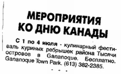 Это еще что, говорит Константин. Вон у них в Канаде проводится роскошный фестиваль куриных ребрышек! Закажите себе полоску вкуснейших жирненьких куриных ребрышек барбекю!