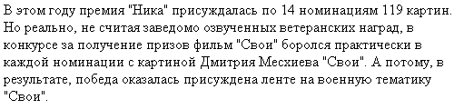 Какая крутая борьба разгорелась на "Нике", удивляется Alexander Melkov. Кто бы мог подумать?!! В каждой номинации борьба, в каждой!