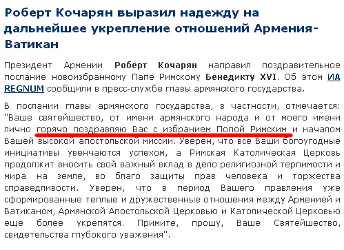 А ведь круто Роберт Кочарян, удивляется Дмитрий Брюккель, поздравил нового Папу! По-свойски так... Интересно, на "Регнуме" приведена точная копия официального поздравления?