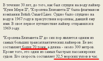 Во-первых, новостисты спутали вес с водоизмещением. Водоизмещение у "Елизаветы" действительно порядка 70, но только тысяч тонн. Вес у нее тоже слегка больше... А скорость 32,5 морского узла В ЧАС - это вообще песня! Морской узел - это и есть скорость, измеряемая в морских милях в час. А 32,5 морского узла в час - это, если хорошо подумать, означает, что корабль плывет со скоростью около 500 метров в час. Тихушный такой кораблик, ничего не скажешь...