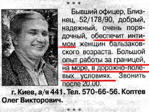 Artem Grigoriev прислал простое, но симпатичное объявление из раздела "Жду" газеты "Бульвар". Обратите особое внимание на то, чем этот бравый военный обеспечит, а также на то, какой опыт он имеет в этом обеспечении...