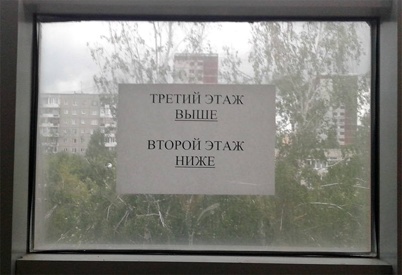 В больнице видал - здание старое, с кучи разных корпусов. Стоишь такой на втором этаже, а перед тобой объявление - 'Терапия, первый этаж' со стрелкой вверх 😄