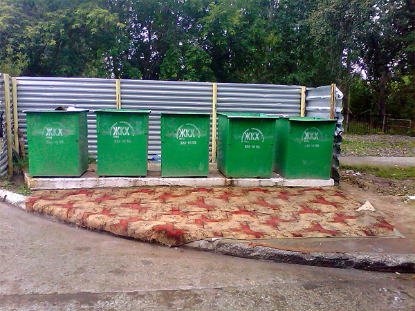 а ковер перед мусорниками вполне логичен: кто-то выбросил палас, дворники его аккурвтно расстелили, дабы потом не подметать рассыпавшийся мусор, а просто свернуть и погрузить