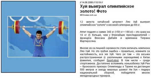 Фамилия, может, и распространенная, только вот фамилия у чемпиона - Ляо (а журналюга, вместо смакования фамилий, мог хоть чуть поинтересоваться грамматикой китайских имен)