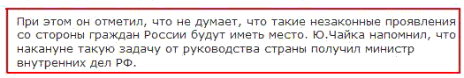 Юрий Чайка уверен, рассказал Кубик, что граждане России не будут незаконно проявляться. Потому что такое задание уже получил министр внутренних дел - его ребята будут незаконно проявляться, выполняя поставленную задачу!