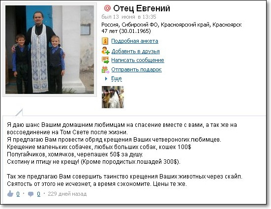 Кроме того, автор объявления и человек на фотографии - это разные люди. Сетевой "креститель" использовал фото священника Александра Орехова. Только вот живёт тот не в Красноярском, а в Приморском крае.