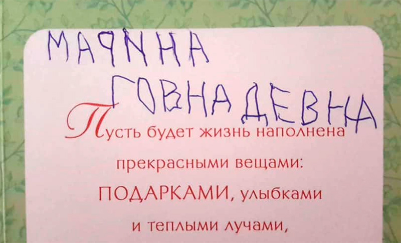 Ребенок очень старался подписать открытку любимой учительнице, вздыхает Марина. Ну, немножко ошибся в отчестве, бывает.