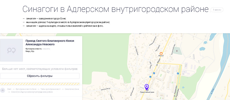 Михаил обнаружил одну синагогу в Адлере. Правда, это Приход Святого Благоверного Князя Александра Невского, но, может, они туда действительно пускают иудеев помолиться?