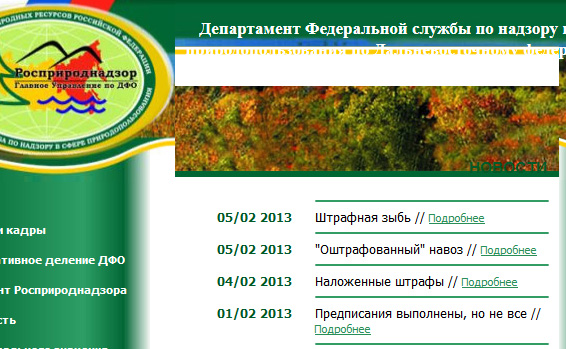 Александр настоятельно рекомендует официальный сайт Департамента федеральной службы по надзору в сфере природопользования по Дальневосточному федеральному округу. Там навоз штрафуют, да и вообще - сайт совершенно дичайший. Такое ощущение, что его делал школьник на коленке. Хотя наверняка на разработку сайта, как обычно, списали несколько миллиончиков народных денег.